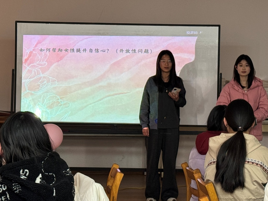 随后的小组讨论环节,女生们分成了若干个小组,分别就“女性学生如何在友情的困惑中找到解决办法?”、“女性如何在公共和私人空间中维护自身安全?”等大家关心的热点问题展开了讨论,并各推选一名代表发言。崔铃灵同学就“外貌焦虑与自我认同”表达了小组的看法,认为女生应打破单一认知,接纳真实自我,实现内外兼修。而女性学生如何在学业、兴趣与社会期待之间找到自己的方向?王思雨小组给出了她们的思考:勇于尝试,多元涉猎,坚持自我,找准人生方向。