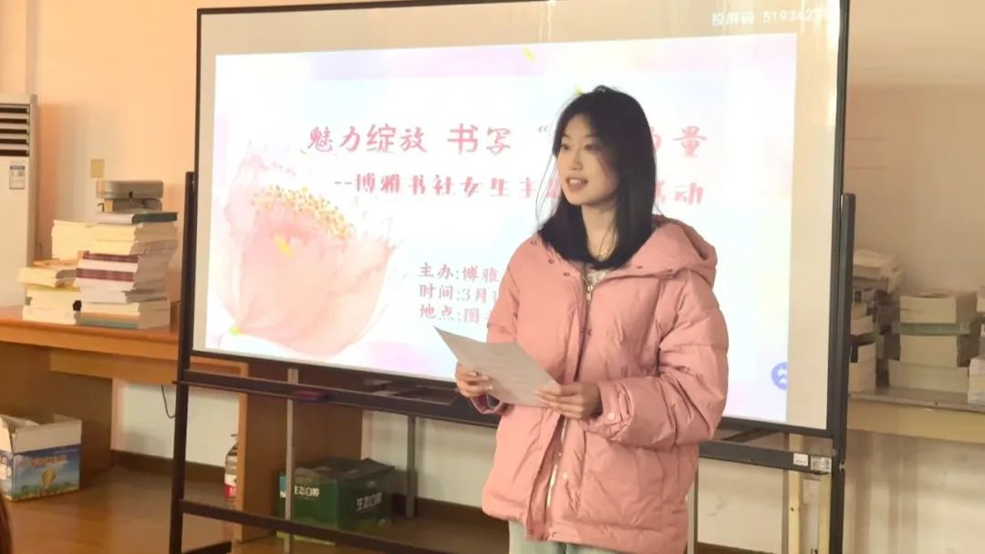 3月18号下午4:10,博雅书社的一群女孩子在如皋校区信息中心二楼北阅览室举办了一场“魅力绽放书写‘她’力量”博雅书社女生主题分享活动。在这里,她们肆意奔跑,聆听花开的声音,感受生命的蓬勃力量。美好随春来,万事皆可待。在主持人石梓声情并茂的开场致辞中,这场春天的盛宴拉开了帷幕。