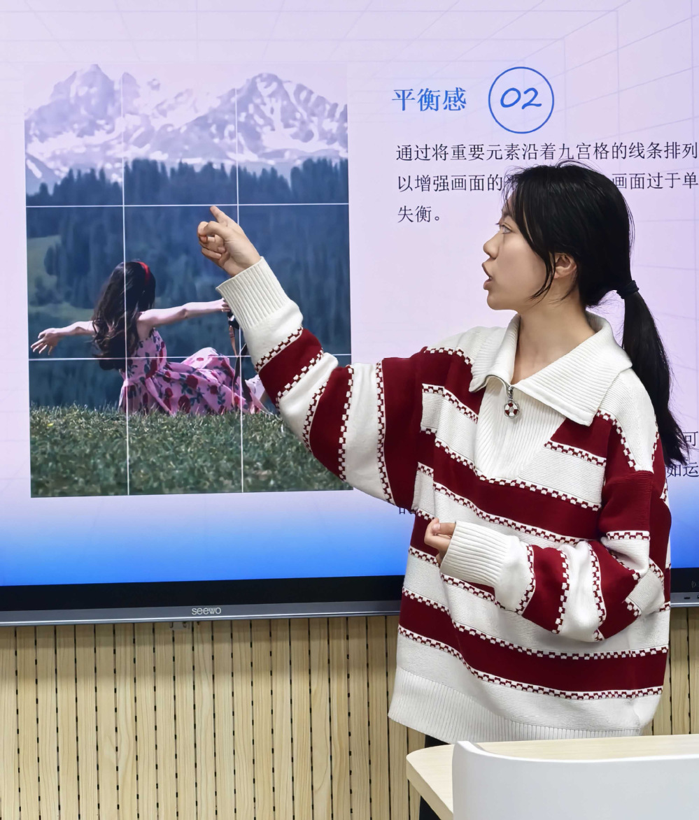 活动伊始,担任主讲的初等教育学院左子奕同学精心准备了主题为“光影逐梦——摄影技能提升”的分享,深入浅出地讲解摄影理论知识。从光圈、快门速度、感光度等基本概念,到构图方法、光影运用技巧等。示范了拍摄过程中锁定焦点后如何进行曝光度调节,怎样选择构图比例。主讲人通过生动的示例和通俗易懂的语言,让原本晦涩的摄影术语变得易于理解。台下同学们认真聆听,积极提问,互动氛围热烈。她还鼓励同学们拿出手机进行亲身实践,体会摄影的魅力。