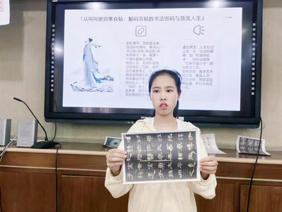 梅婧兰同学带领大家走近具有“呵呵达人” “虐文男主” “吃货人设” “跨界顶流”之称的宋朝六边形男神苏轼。她化繁为简,从书法鉴赏角度向同学们介绍了这位洒脱不凡的北宋大才子。作为书法界的顶流,天下第三行书《黄州寒食诗帖》表现了他“执笔无定法的”高超书法技艺,《江上帖》则体现了他“因字赋形”的意趣以及豁达洒脱的人生态度。他的书法艺术源于生活也超越生活,可谓“一衰烟雨任平生”!