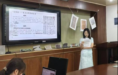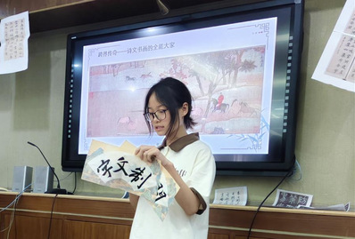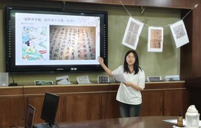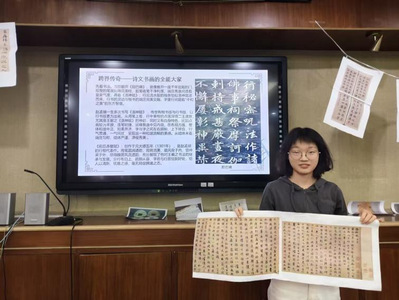 接着,谢旋旋带同学们领略“名人风采”,向大家详细介绍不同时期各种字体集大成者及其作品和风格。随着PPT的翻动,一个个生动有趣的小视频的播放,一件件陌生久远的作品纷至沓来,伴着谢旋旋趣味盎然的介绍,同学们仿佛身临其境,会议室里不断传来欢声笑语和阵阵赞叹声。