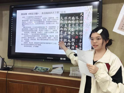 袁星琳同学以正义之人书正义为题,提出不仅要赏书法之形,更要赏书法之性。以唐朝颜真卿的生平为引,从情感和笔法两个方面分析了天下第二行书《祭侄文稿》的重要意义及带给后人的启示。楷书大家的草行混写,234字中的34处涂改,字字泣血,由字观人,由人观世。