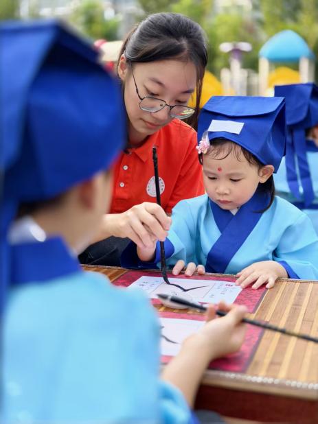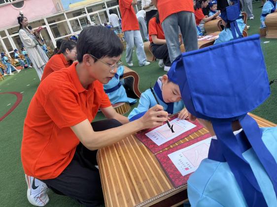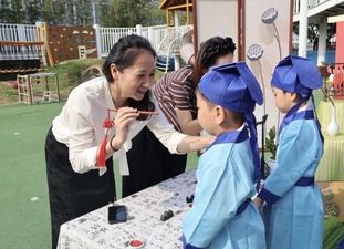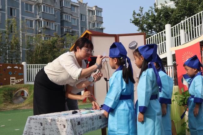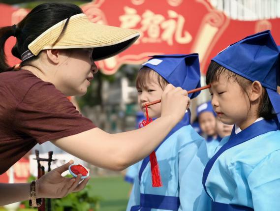 “朱砂一点,智慧开颜!”街道领导、幼儿园园长和南通师范高等专科学校的老师们,手持蘸着朱砂的毛笔,轻轻地在每个孩子眉心点上一颗鲜红如宝石般的痣。“痣”与“智”谐音,更寄托着“开启智慧、心明眼亮”的殷切期望,孩子们的脸上满是庄重与期待。