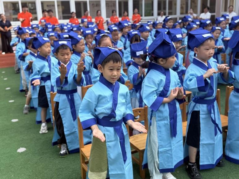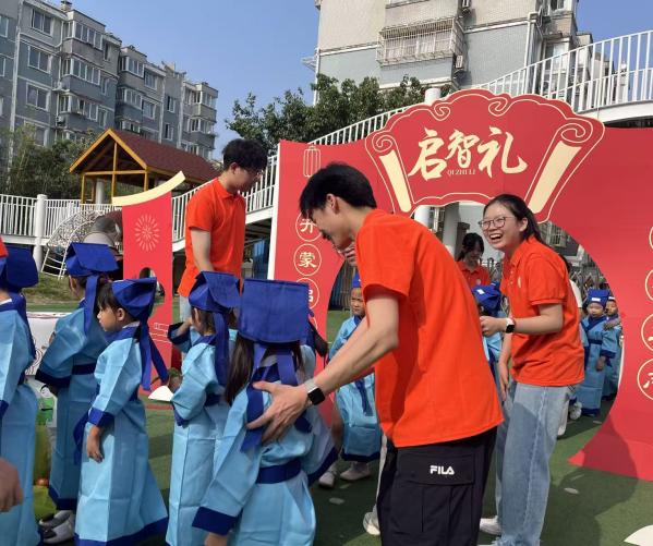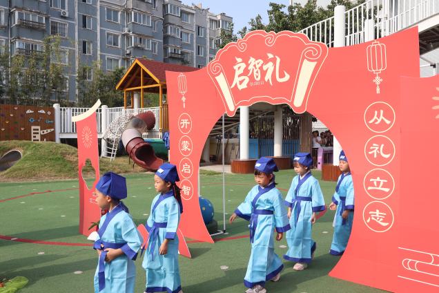 幼儿园老师早早布置好寓意“开启智慧”的启智门,孩子们身着统一的浅蓝色童生服,排着整齐的队伍,迈着轻快的脚步依次穿过。朱红的门楣、飘动的彩绸,搭配孩子们清脆的笑声,寓意着从此踏上“明事理、学知识”的成长之路。