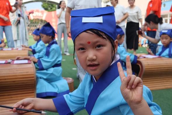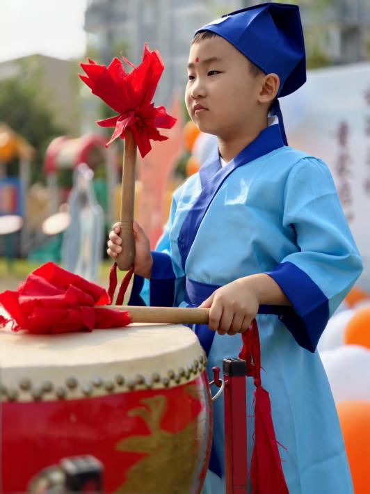 “古代学童立下志向时,会击鼓明志。”在教师的引导下,孩子们手持鼓槌击鼓三声,并响亮说出自己的心愿:“我想好好学习”“我想成为科学家”“我想当老师”……清脆的鼓声与真挚的童言交织,成为活动中最动人的旋律。