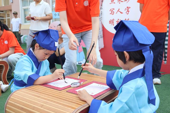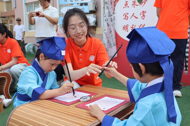 “人”字虽简,寓意深远。读者协会的志愿者们手把手地教孩子们握笔,在宣纸上学写“人”字,体会端身立正、学做真人的道理。孩子们端正坐姿、专注握笔,于一撇一捺中感受为“人”之初的庄重。