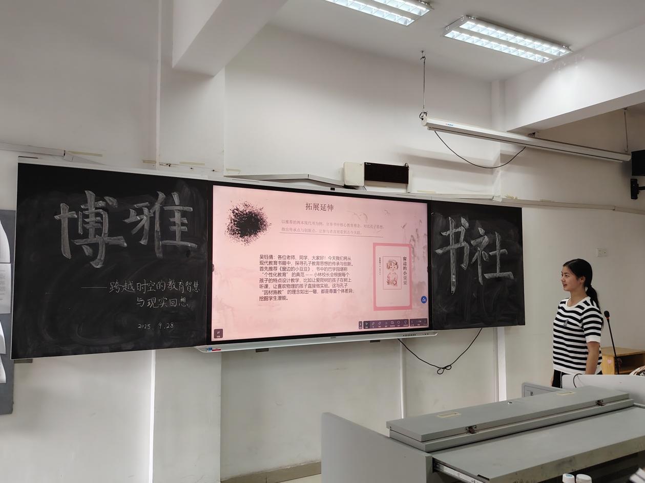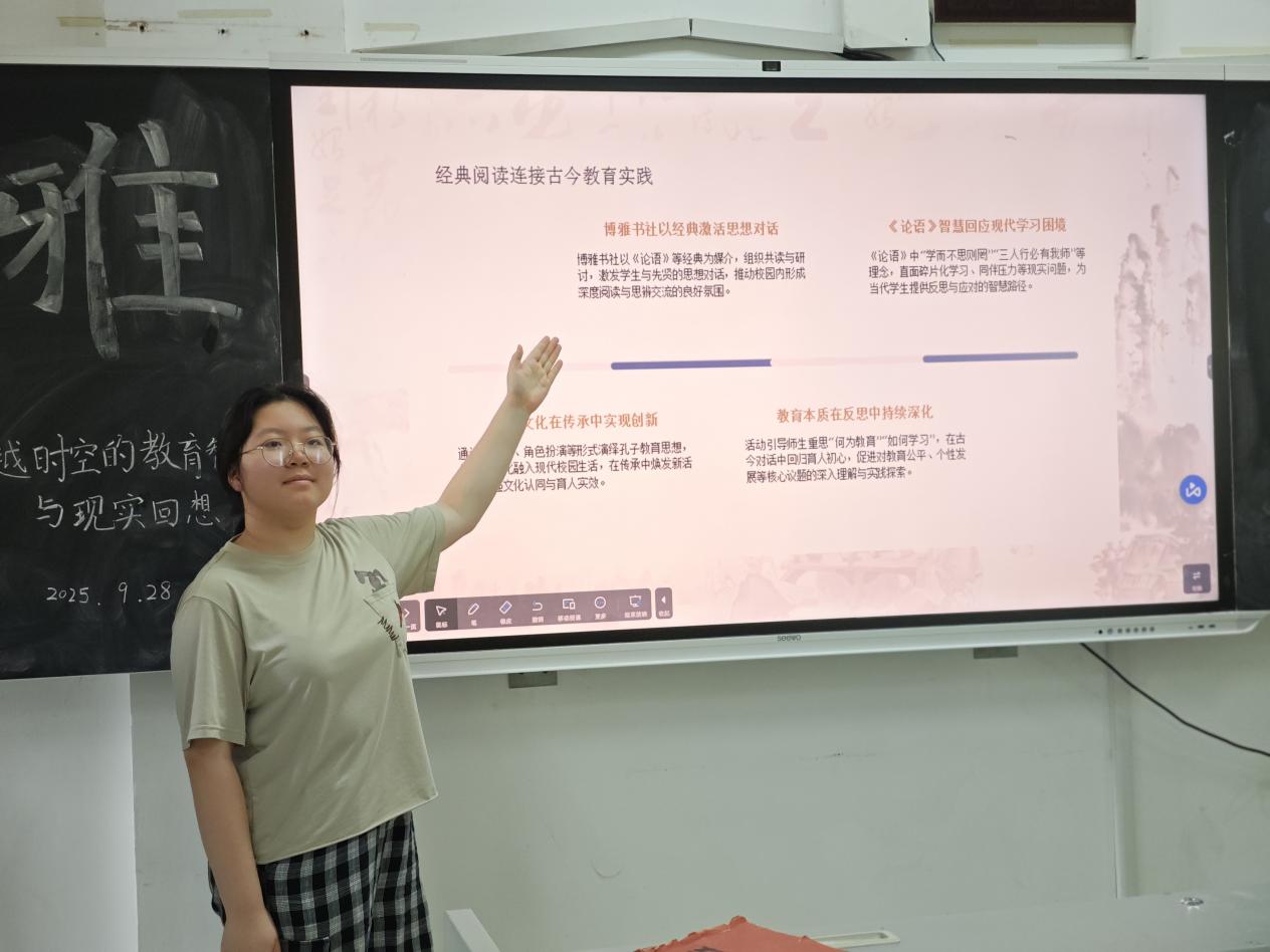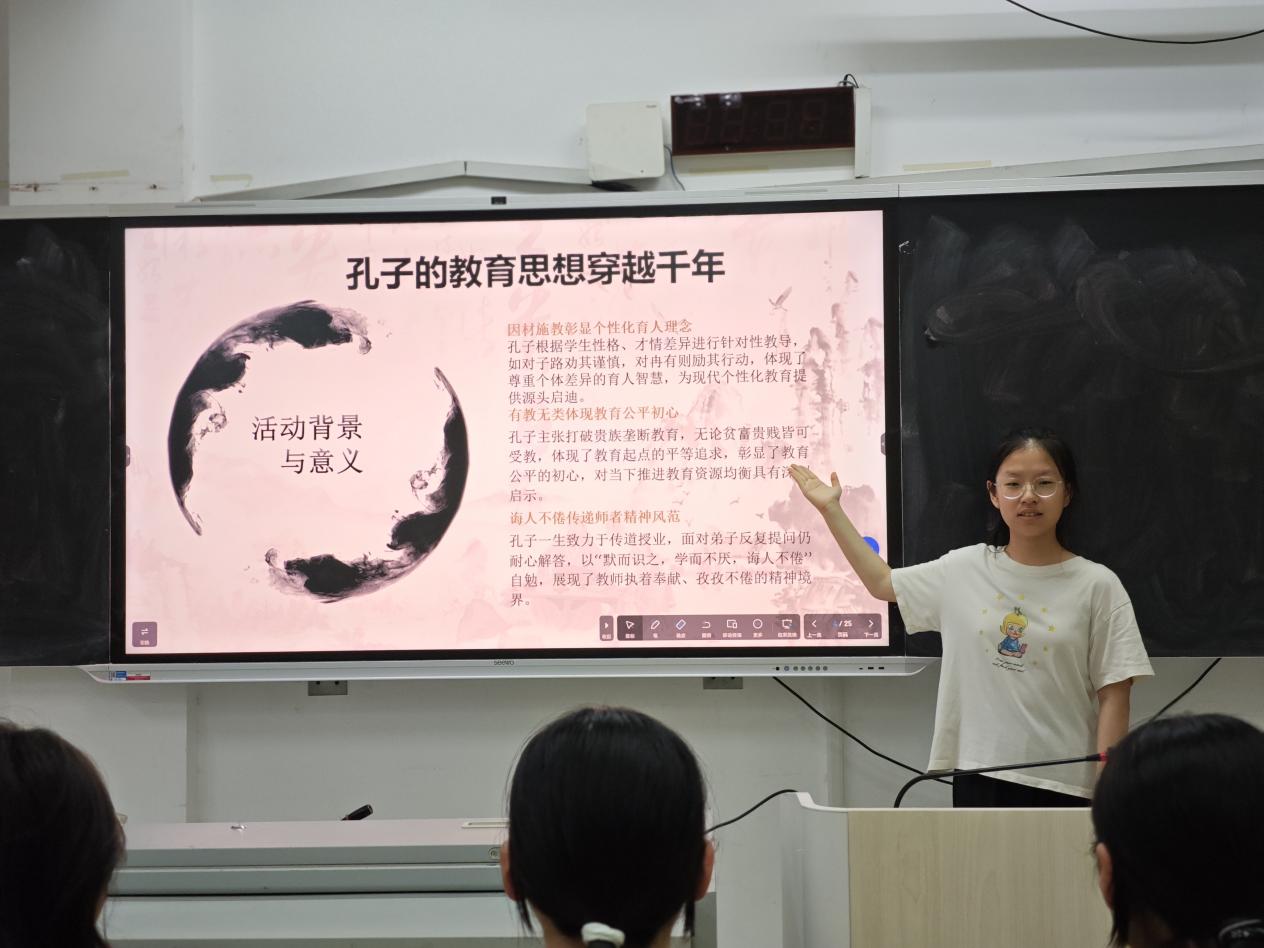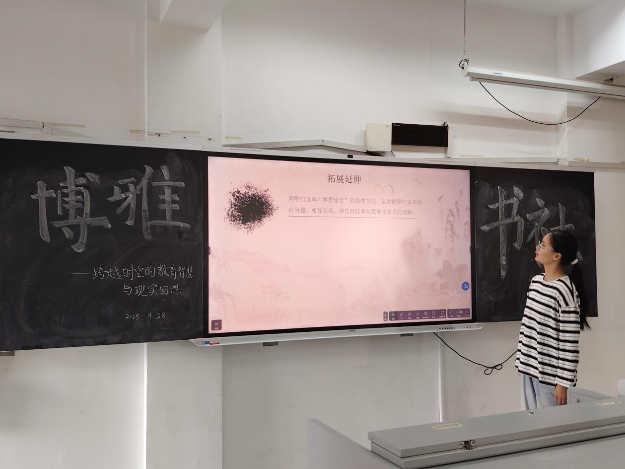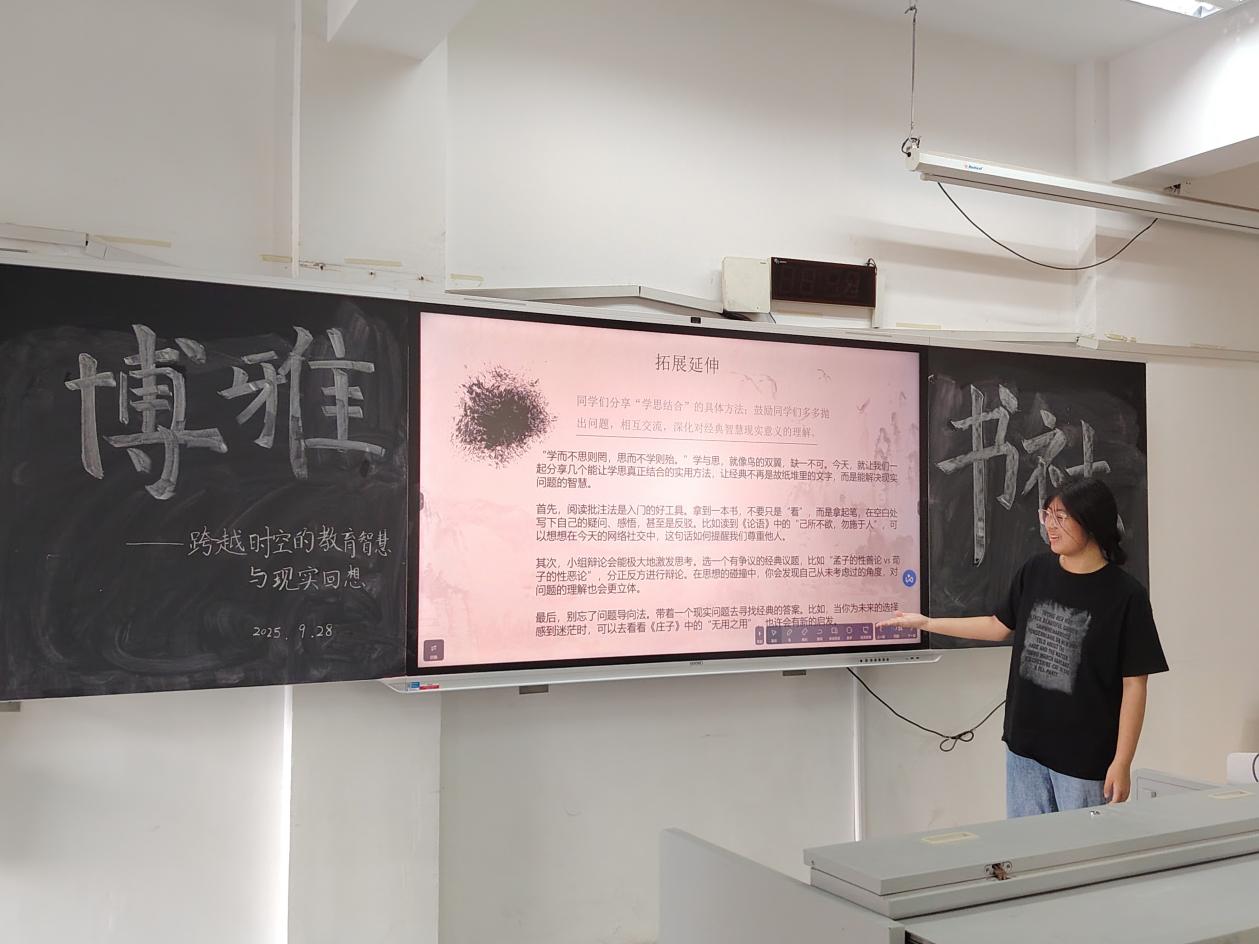 从《窗边的小豆豆》里尊重天性的“散步教学”,到《第56号教室的奇迹》中点燃心灵的“育人智慧”,经吴钰倩、黄梓钰等同学的深入剖析,这些教育理念与孔子“浴乎沂,风乎舞雩”的教育理想隔空回响,共同谱写着从“诲人不倦”到“关怀心灵”的教育新章。