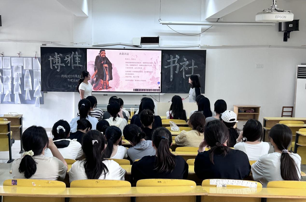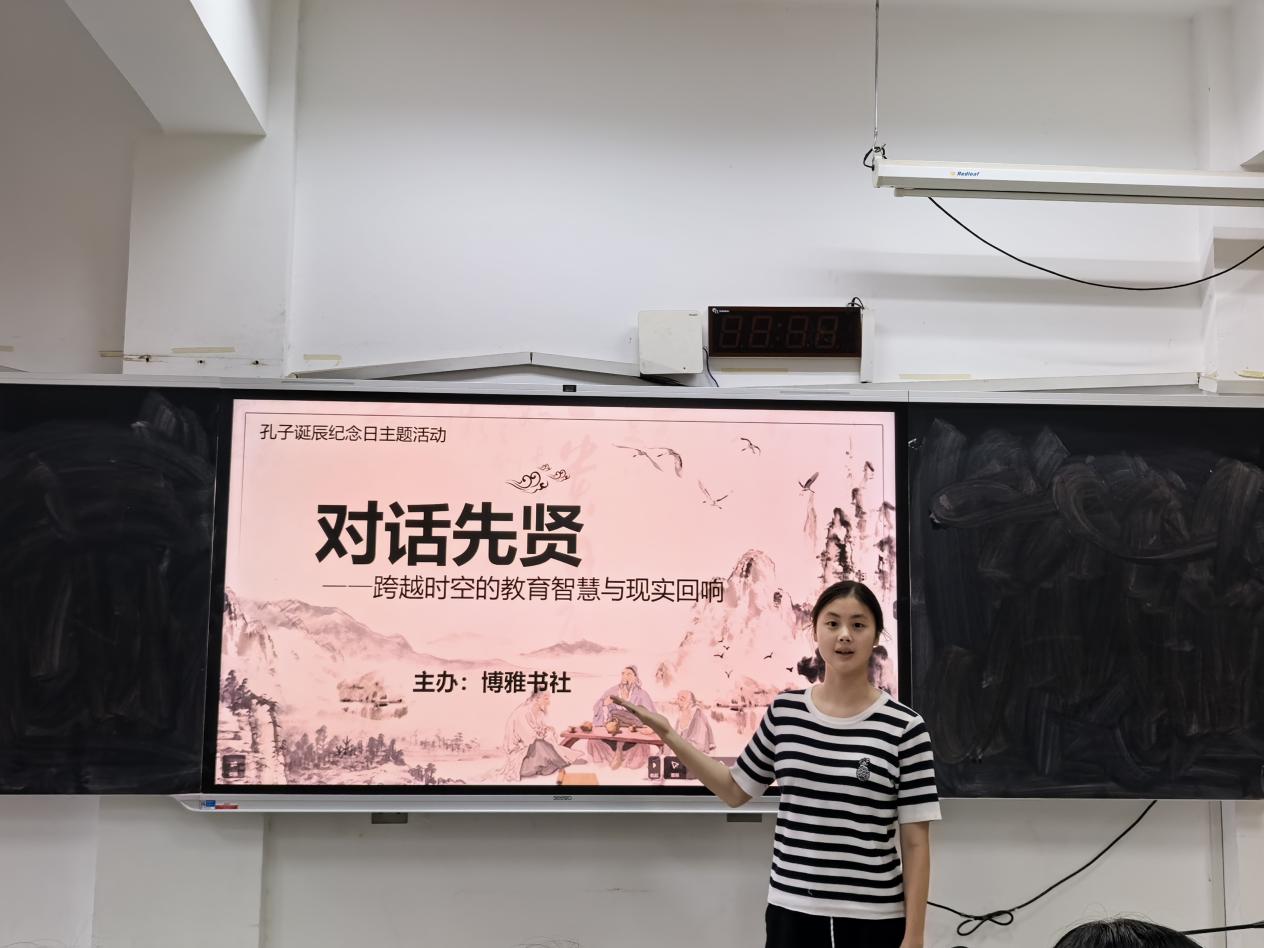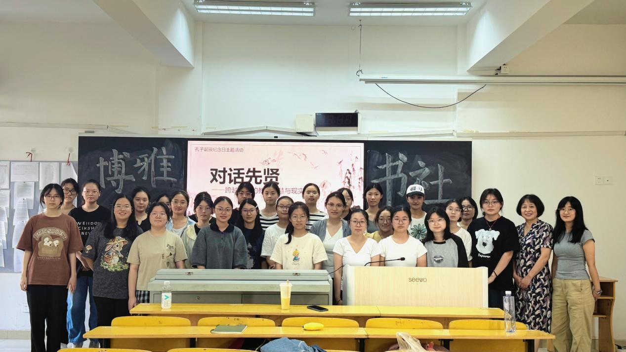 “两千多年前,他以‘有教无类’破阶层之隔;两千多年后,我们以典籍为桥,探寻教育真谛——当孔子的智慧遇见现代校园,会碰撞出怎样的火花?”9月28日下午3时30分,恰逢孔子诞辰2576周年纪念日,由博雅书社主办的“对话先贤:跨越时空的教育智慧与现实回响”主题活动,在如皋校区四方学馆二楼阶梯教室温情启幕。众多同学与指导老师李俊青齐聚一堂,通过光影呈现、经典诵读、思辨研讨与时空对话等多种形式,共赴一场跨越古今的教育对话之旅。