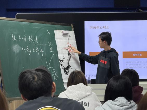 现场同学们皆凝神静气,近距离感受中国水墨“以形写神”的独特魅力。黄冠铨同学一边创作,一边讲解国画的基本笔法与精神内涵,让大家深刻体悟到,画梅画竹,描绘的不仅是物象,更在传递“不要人夸好颜色”的梅之傲骨与“千磨万击还坚劲”的竹之气节。