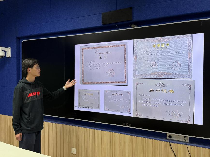 活动伊始,黄冠铨同学便带领大家走进他的 “传统文化兴趣世界”。谈及兴趣启蒙,他感恩母亲的引导与鼓励,加之自身的坚持不懈,他不仅在传统文化的多元兴趣中不断成长,更收获了诸多亮眼成绩。