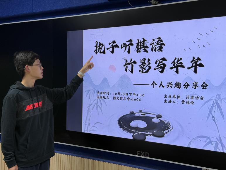 10 月 23 日下午,通师高专学生讲堂第十七期——“执子听棋语,竹影写年华”在开发区校区图文信息中心 606 室举行。初等教育学院黄冠铨同学担任主讲人,他以自身对传统文化的多元兴趣为核心,分享了在围棋、书画等领域的探索历程与心得感悟,读者协会20余名会员齐聚现场,共赴这场浸润着古韵与诗意的传统文化之约。