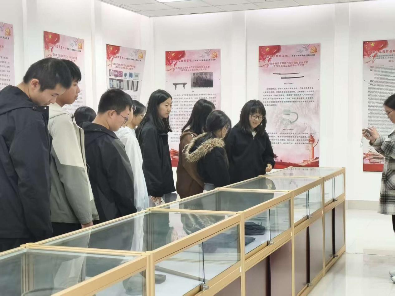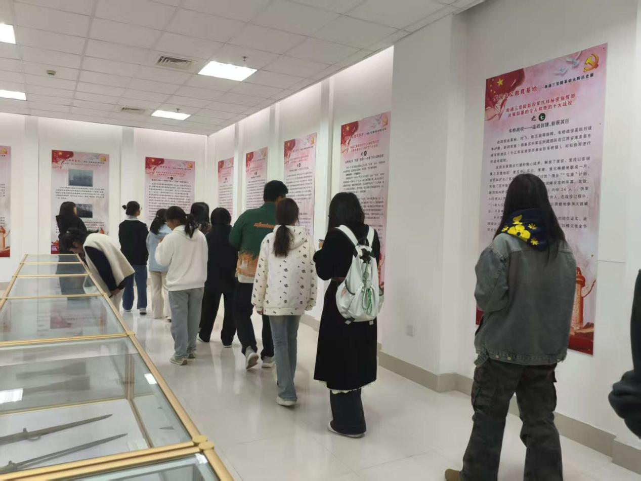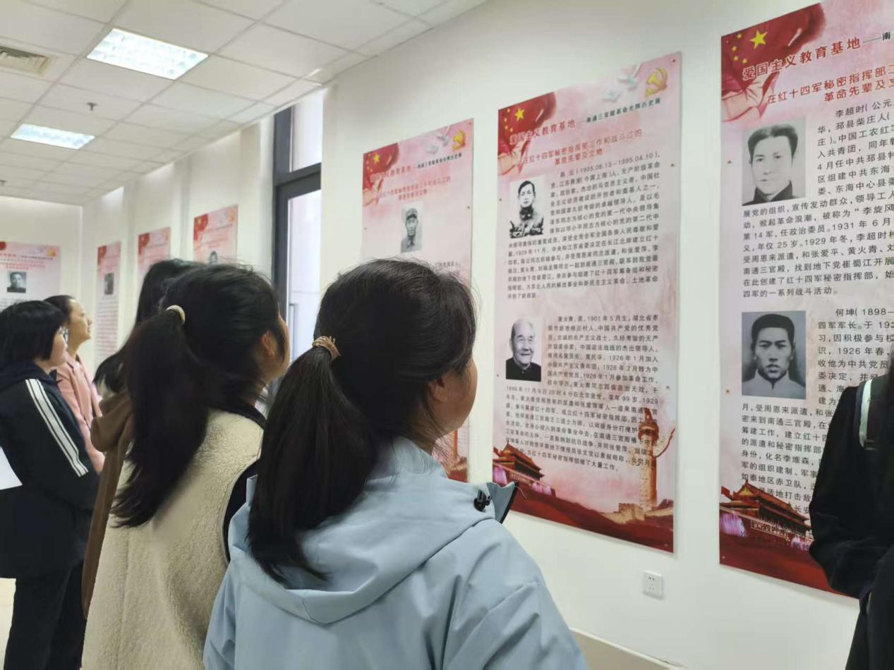 活动首站,走进南通师范高等专科学校爱国主义教育基地,沉浸式参观“南通三官殿抗战革命光辉历史展”。协会成员沿展线有序前行,从追溯三官殿的历史渊源起步,到重温革命时期的辉煌战绩,从子弹头、军事训令等文物,再到先辈足迹与亲历者回忆,一幅幅珍贵的画面、一段段感人的往事,都让同学们驻足凝视、轻声交流。透过这些痕迹斑驳的文物,一段可歌可泣的南通地区革命历史徐徐展开:土地革命与抗日战争时期,活跃在这里的革命先驱们抛头颅、洒热血,用生命捍卫民族独立的壮举历历在目。“看到先辈们为家国安宁、民族复兴不懈奋斗的实物见证,我更加理解了‘爱国’二字的重量。” 陈顾嘉同学在参观后动情地说。
