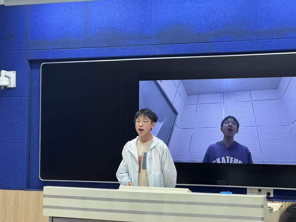 红色经典传递的感动尚未褪去,现场氛围便被歌声与笔墨推向新的高潮。这份由阅读生发的炽热情感,化作了嘹亮的歌声与苍劲豪迈的书法。陆朱轩同学演唱《梦想的远征》,抒发了作为新时代青年把个人理想追求和国家发展目标紧密结合的宏图壮志;丁子喻同学带来的《如愿》,用深情的旋律传递出对先辈的致敬与对祖国的热爱。刘俊嘉同学现场展示软笔书法作品《七律·长征》,一笔一划间尽显革命豪情与书法魅力。