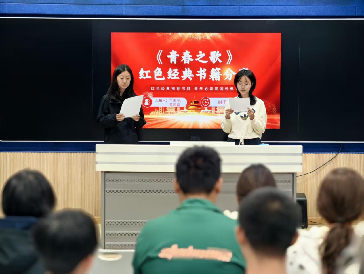 参观结束后,红色经典分享环节如期开启,同学们轮番登台,带来一场浸润心灵的红色文化盛宴。陈顾嘉、丁禹澄同学以《青春之歌》中林道静的成长历程为切入点,带领大家感受青春与信仰的力量;张陆伟、崔雅欢同学深情诵读《红星照耀中国》,田逸铭、万欣妍、汪雪纯、程柯富则对其进行深入解读,从不同角度重温长征路上强渡大渡河、飞夺泸定桥的英雄壮举;还有张严慧同学关于《红岩》的书目分享,让革命先烈的忠诚与坚守震撼人心。