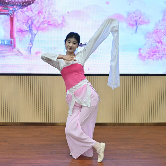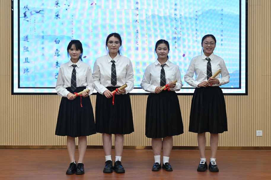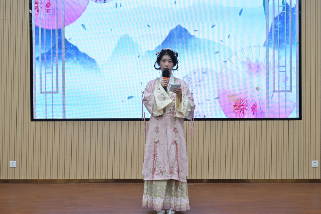 展演环节精彩纷呈。付微、崔铃灵、徐吴茜、张雨星等同学通过《子衿》的深情吟诵与演唱,将“青青子衿,悠悠我心”中蕴含的缠绵悱恻情思娓娓传递。余韵未消,一曲《桃夭》翩然而至。陈奕晓同学以曼妙灵动的舞姿,生动诠释了“桃之夭夭,灼灼其华”的绚烂意境。声舞相融,相得益彰,将古典诗词的意境之美展现得淋漓尽致。