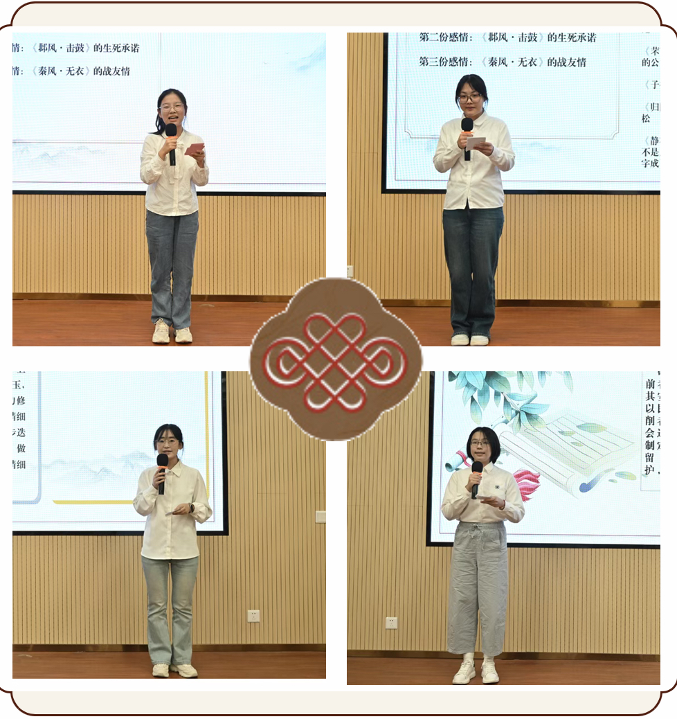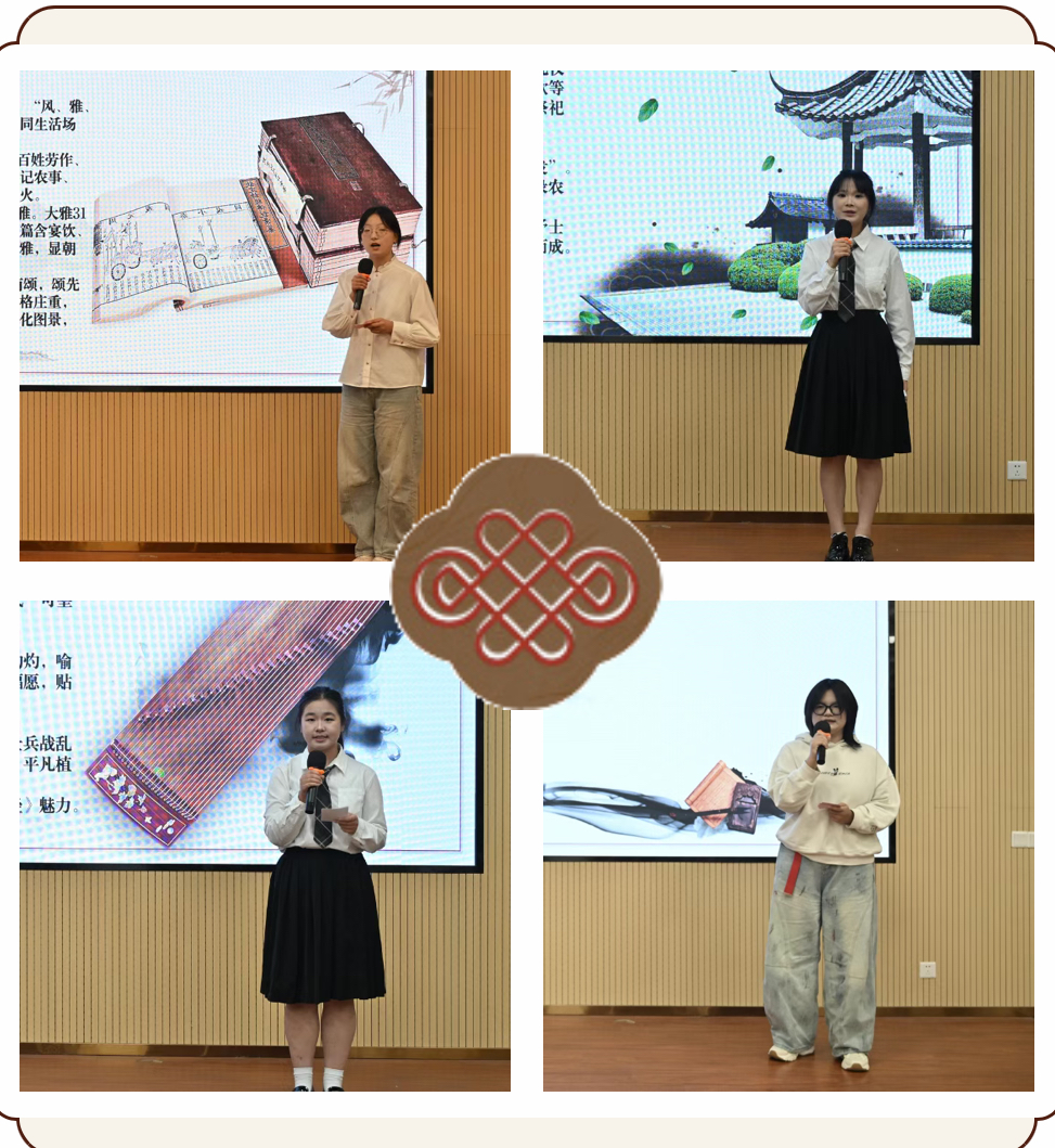 在“经典共赏”环节,黄钰涵以“诗源初探,文脉寻根”为题,系统解析了“风、雅、颂”的体系脉络,阐释了“饥者歌其食,劳者歌其事”的现实主义创作精神;此外,崔铃灵从历史背景出发,深入阐释《诗经》的创作源头。在“草木寄情,意象解码”部分,张雨星解读了“蒹葭”、“桃夭”等意象的文化寓意;毛紫钰通过对比分析同一意象的不同表达,展现了古人“托物言志”的艺术智慧。