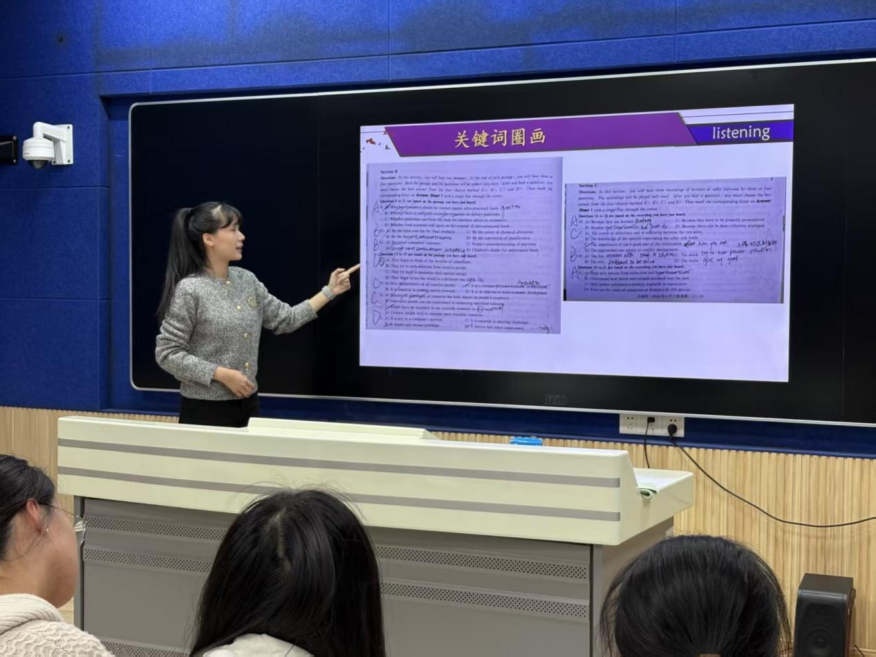 针对多数同学的听力短板,分享从“题型拆解”切入,清晰梳理短对话、长对话、短文理解的出题逻辑与陷阱设置。她强调,听力提分的核心在于“抓关键词+及时复盘”:听音时需快速圈画时间、地点、人物及转折词等关键信息;错题订正时,务必“重听原文”,通过反复跟读,培养语感与瞬时辨音能力,逐步攻克听力难关。